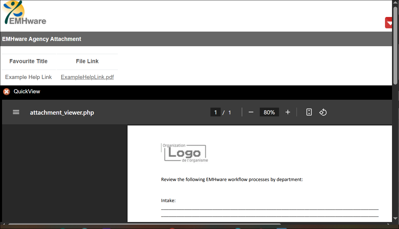 - Review the file. Depending on the format, users will be able to access the attachment through the QuickView attachment viewer, such as PDFs. The PDF can be printed or downloaded. For file types that do not display in Quickview, such as .docx and .xlsx when the File Link is selected, the file will automatically download to be viewed.