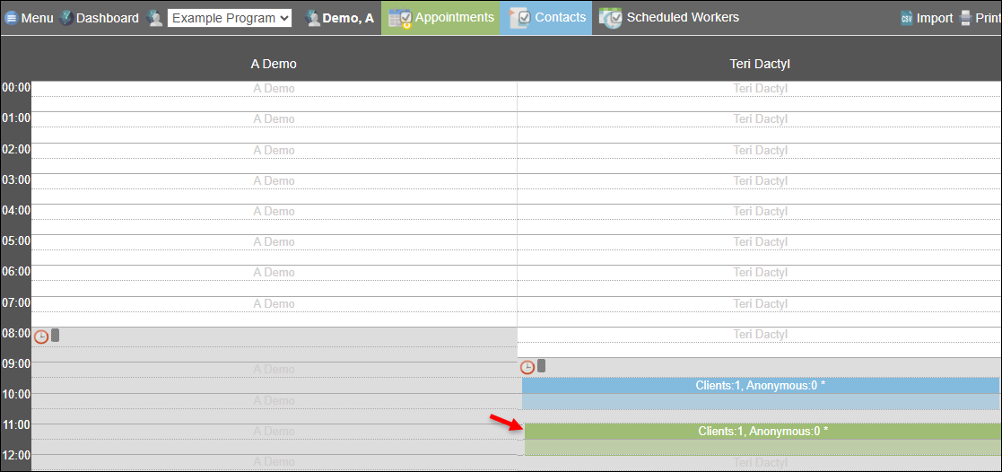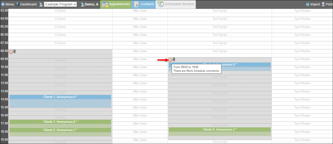 - The Scheduler View shows Worker Schedules (grey), Appointments (green), and Contacts (blue). Unselect any of the boxes to filter the display, like in the Dashboard calendar view.