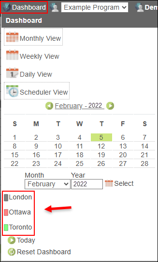 - Select the Dashboard dropdown to view a legend of the Sites and their designated colour. Use this menu to change the Month, Year, and Day displaying on the Scheduler View, select Today or Reset Dashboard to return to the default Dashboard calendar view.