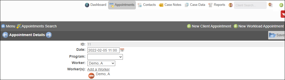 - The page will redirect to the Appointments global tab to create a new appointment. Select the Program and complete all appointment details.