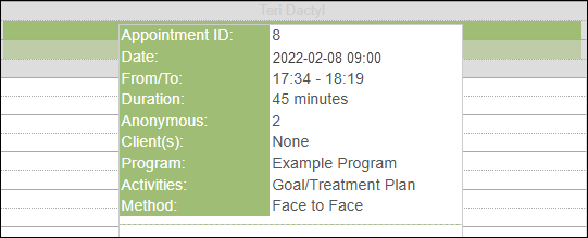 Hover over any Appointment or Contact displaying on the Scheduler View to see a summary of details.