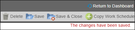- Select Save. A confirmation message will appear along with optional Delete and Copy Work Schedule buttons → use as needed. Select Return to Dashboard to view the Scheduler.