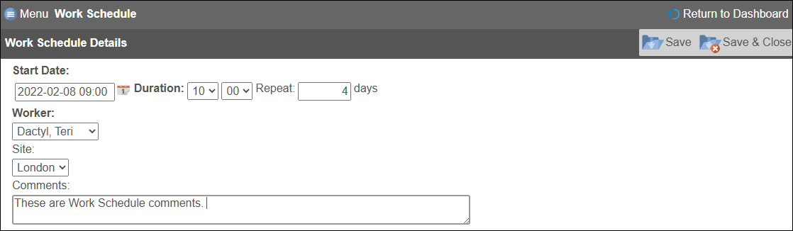 - Alternatively, select anywhere on the scheduler and update the details on the Work Schedule page.