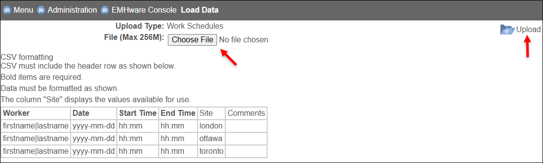 - For workers with the permission to access, the page will redirect to Administration → EMHware Console → Load Data with the Work Schedules Upload Type automatically selected.
