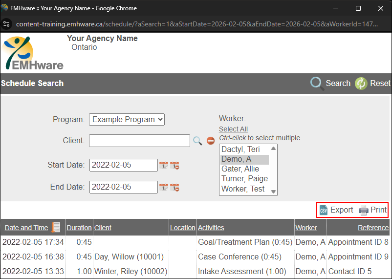 - Select a Program from the dropdown to view workers assigned to an agency program. A pop-up will ask, "Scheduled Workers Only?" → Select OK to view only program workers who have set work schedules.